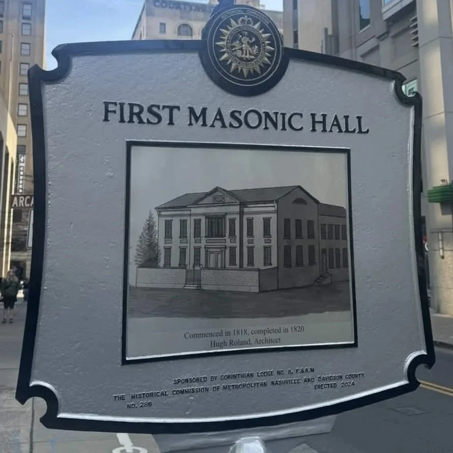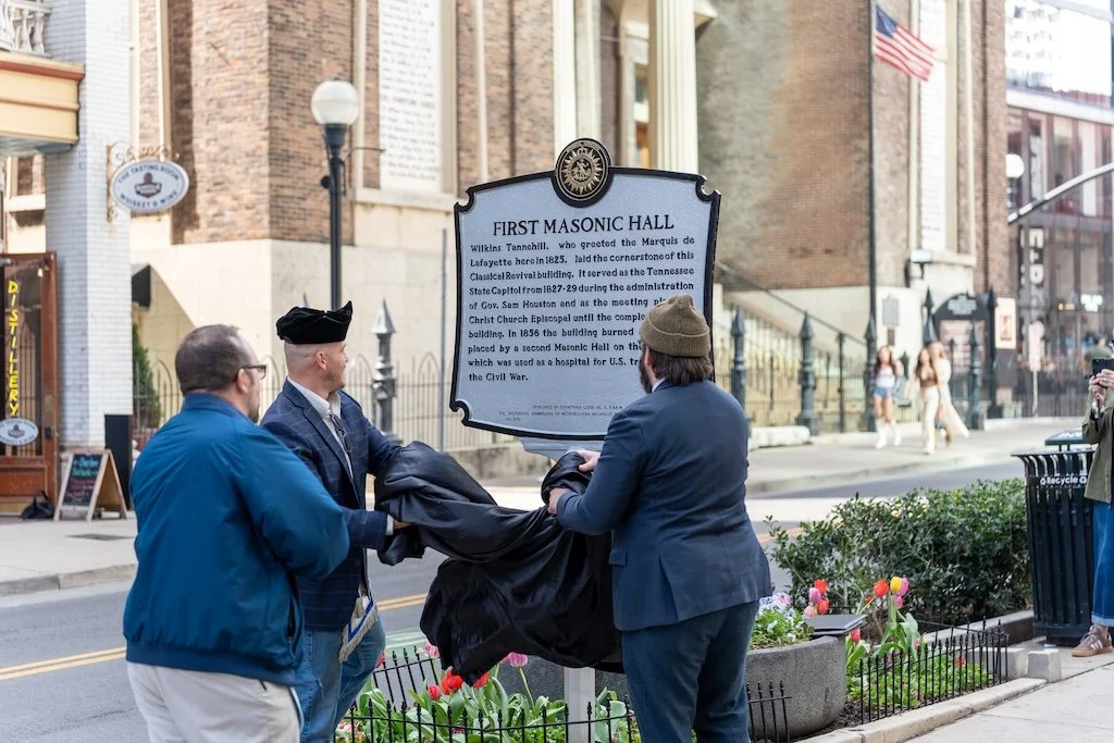 As early as 1814, the members of Cumberland Lodge were trying to construct their own building. Prior to this building, they rented an upstairs room “on Market Street near the Public Square”. Market Street was what today is known as 2nd Avenue. The Brethren of the Lodge raised $1,625 through subscriptions to purchase this very lot. While we don’t know the final cost of the building, we know that like Solomon’s Temple it was about seven years until it was finally completed—in time for the visit of General Lafayette in 1825. That was only one event in this building’s history, and we couldn’t fit but a few on the marker—so we hope this will be a breadcrumb that will inspire the curious lover of history to learn more about what happened right here.