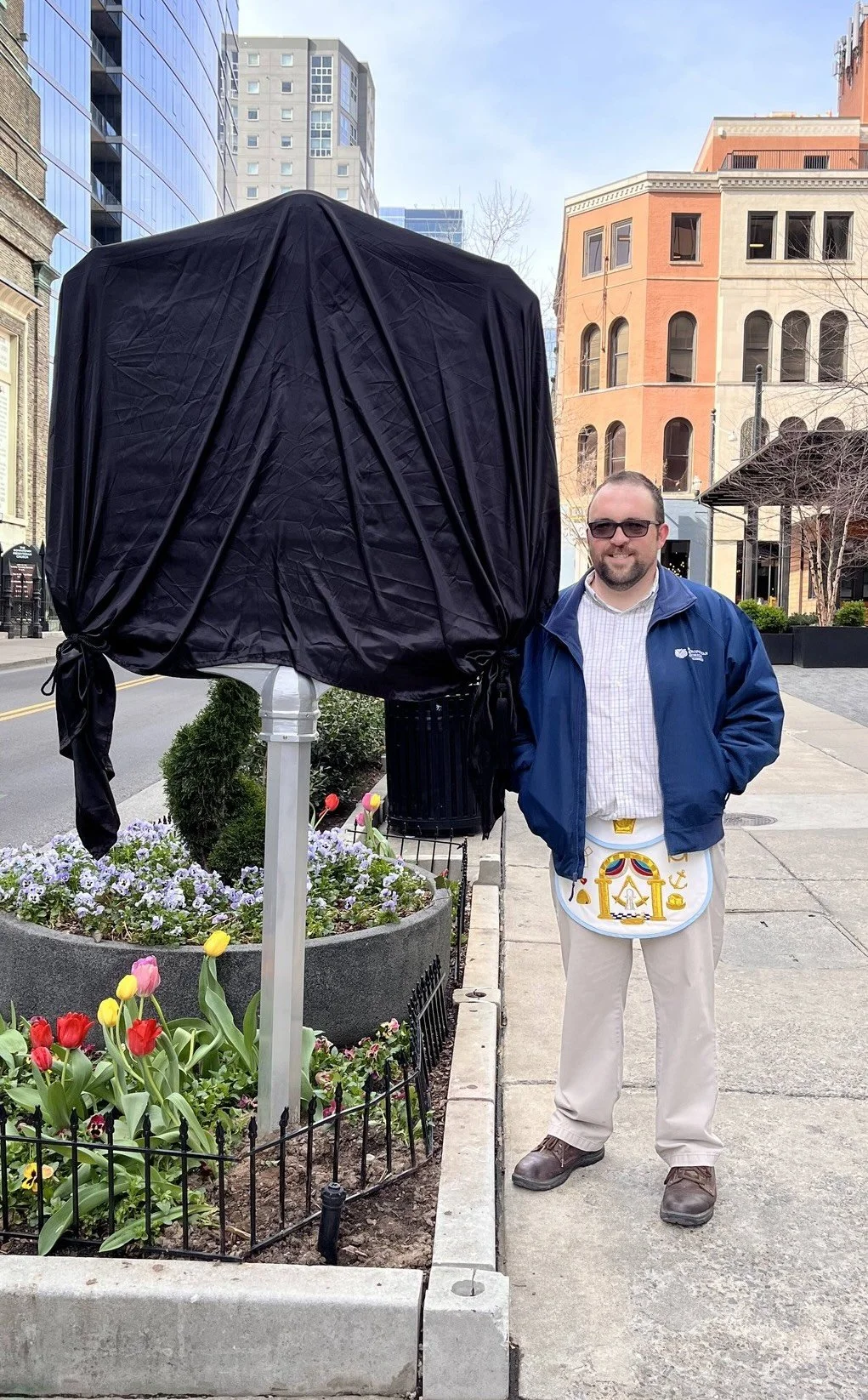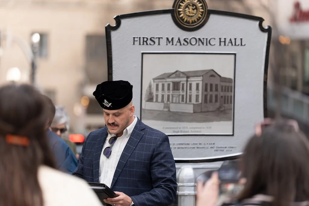 A member of Beech Lodge found the marker and brought it in to his lodge where Bryan Gilley with the Metro Historical Commission and a Past Master of Beech Lodge decided to try to get it placed back on the wall. Due to policy changes the marker was unable to be reattached to the building and that led to the pursuit of a new historical marker that could be placed on a post on Church Street in front of the building’s location on the other side of Arcade Alley.